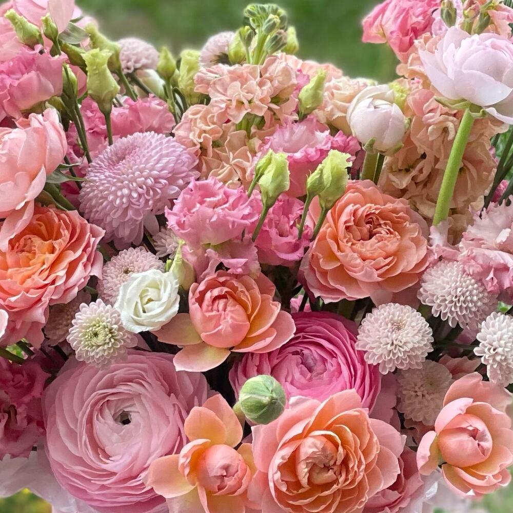Альстромерии, Гвоздики, Кустовые розы, Лизиантусы, Розы, Хризантемы