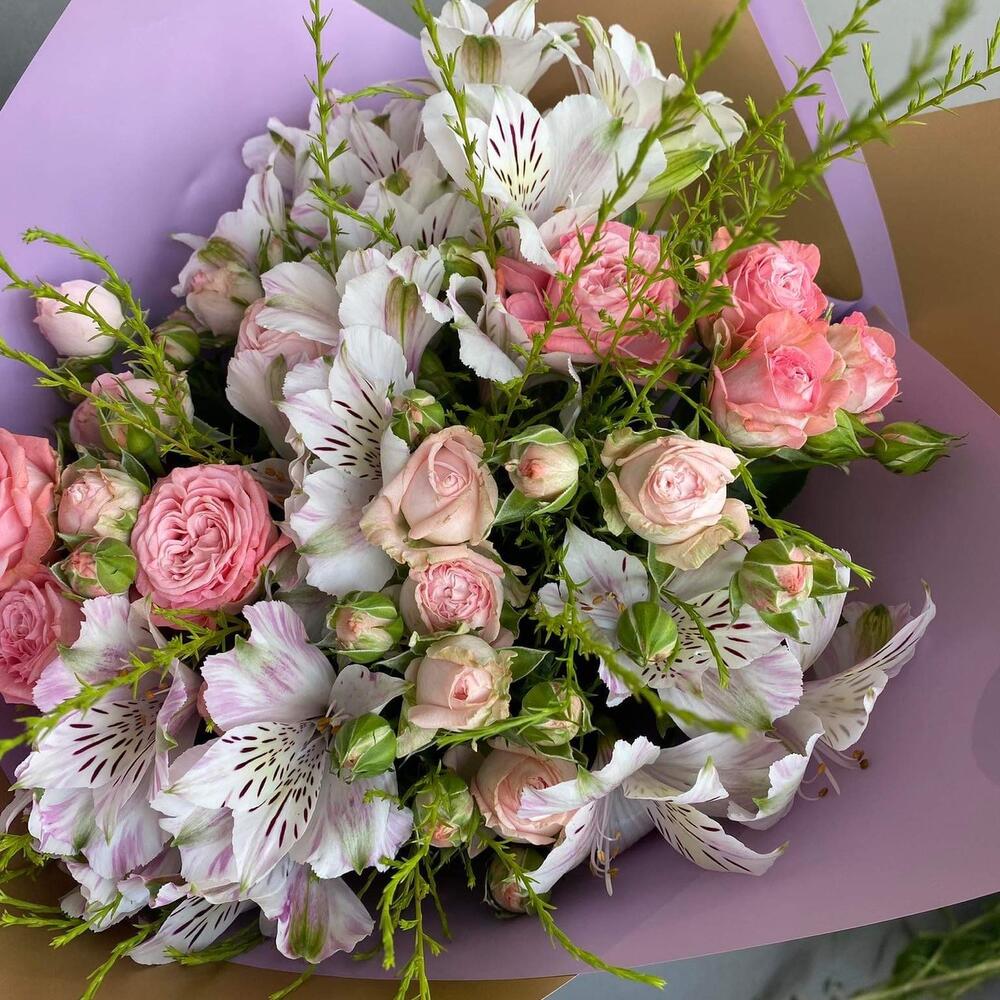 Альстромерия – 5 шт. Зелень – 3 шт. Спрей роза – 5 шт. Открыточка с вашими пожеланиями – 1 шт. Упаковка дизайнерская – 1 шт.