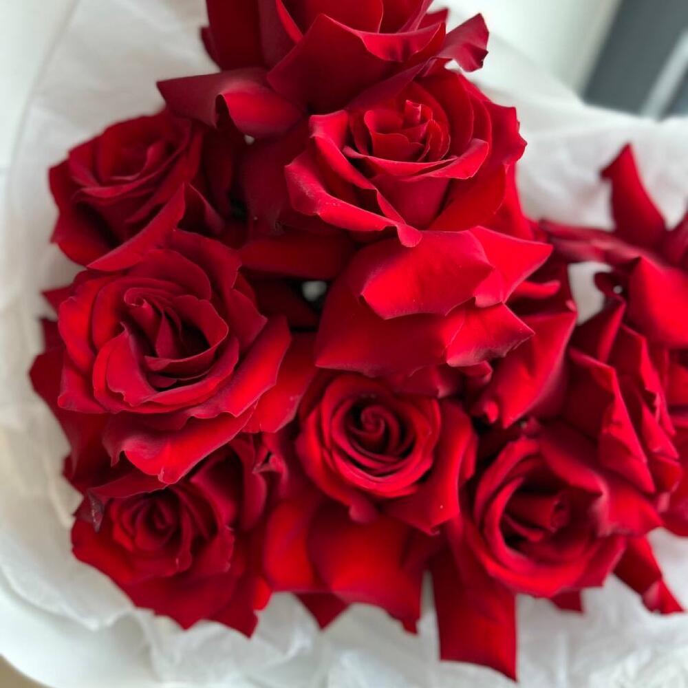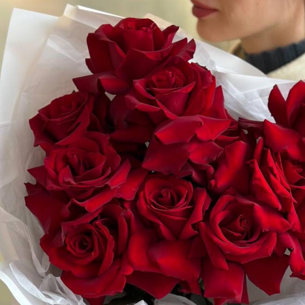 Французские бархатные алые розы в белоснежной упаковке