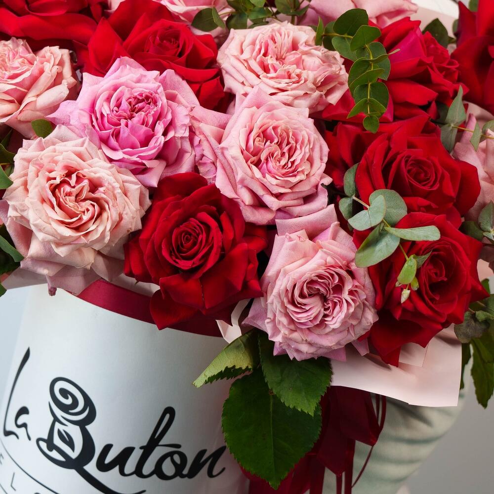 Эвкалипт – 3 шт. Роза – 21 шт. Коробка – 1 шт. Оазис флористический – 2 шт.
