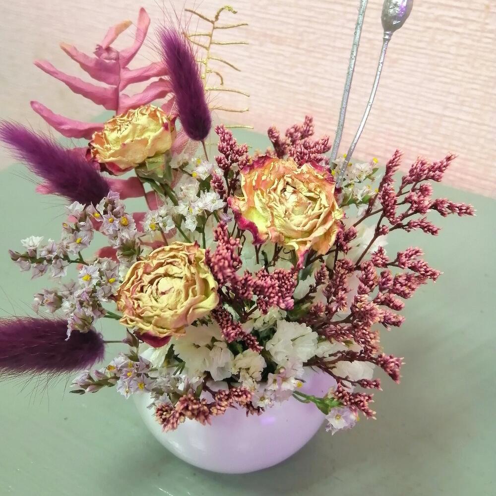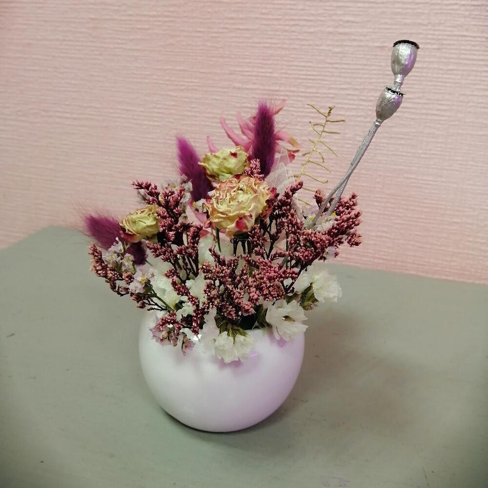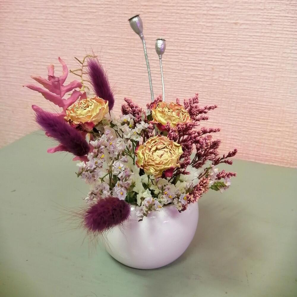Роза кустовая сухоцвет – 1 шт.Лагурус (сухоцвет) – 3 шт.мак коробка – 2 шт.лимониум сухоцвет – 1 шт.Оазис флористический – 1 шт.Кашпо керамическое – 1 шт.