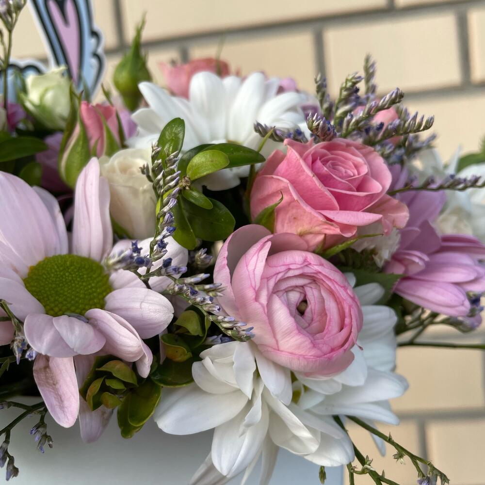 Роза кустовая – 2 шт.Хризантема кустовая – 3 шт.Лимониум – 2 шт.Статица – 2 шт.Ранункулюс – 1 шт.Самшит – 1 шт.Губка флористическая – 1 шт.коробка для цветов – 1 шт.