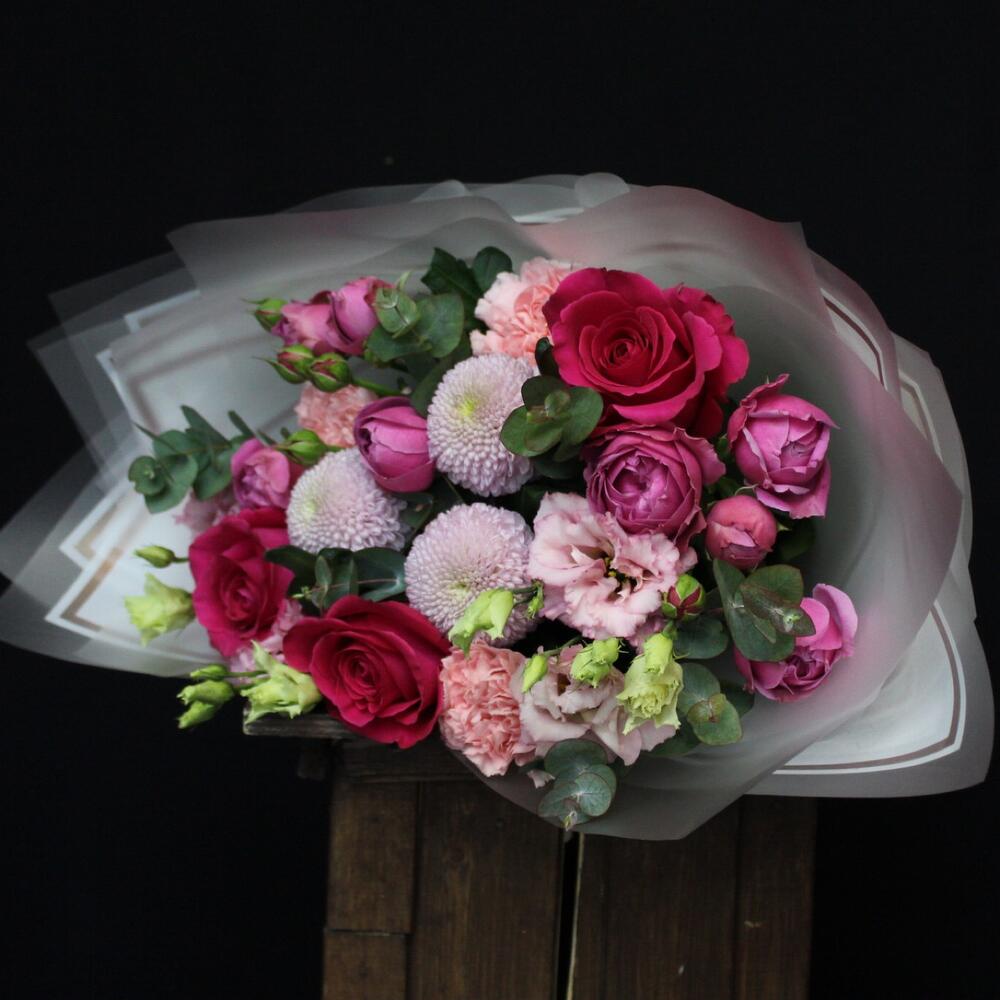Роза Pink Floyd – 3 шт.Хризантема момоко – 3 шт.эустома махровая розовая – 1 шт.роза кустовая пионовидная misty bubbles – 2 шт.Диантус – 3 шт.Эвкалипт – 3 шт.Пленка матовая – 5 шт.Лента атласная – 2 шт.