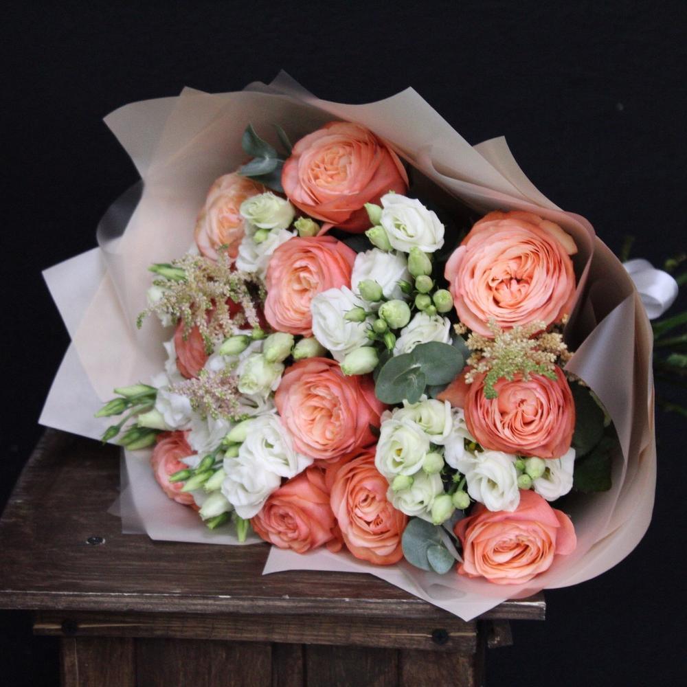 Роза пионовидная кахала – 11 шт.Эустома – 5 шт.Астильба – 3 шт.Эвкалипт – 3 шт.Пленка дизайнерская – 5 шт.Лента атласная – 2 шт.