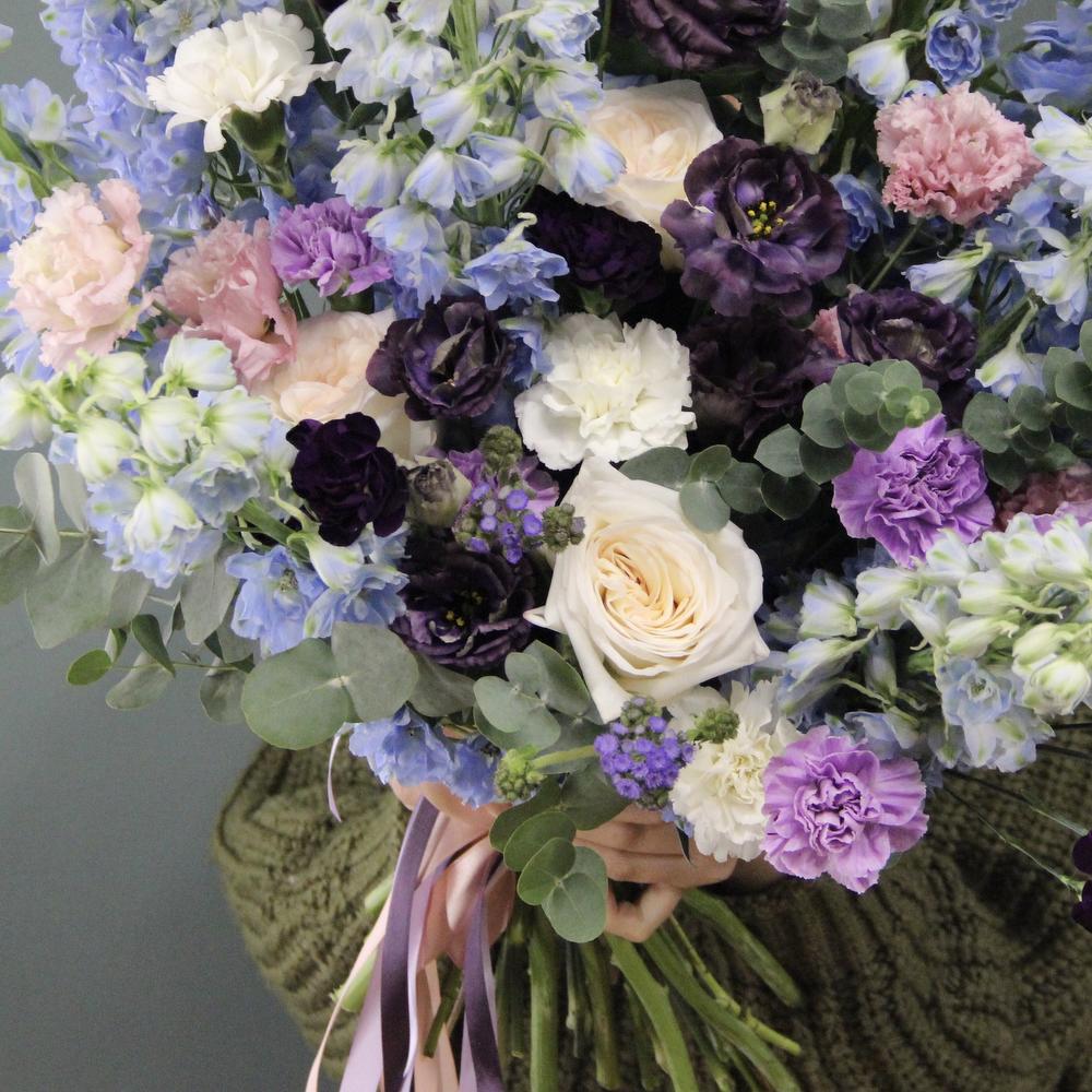Дельфиниум – 9 шт.Лизиантус – 11 шт.Диантус – 15 шт.Роза пионовидная – 7 шт.Твидия – 5 шт.Эвкалипт – 9 шт.Фисташка – 4 шт.Лента атласная – 3 шт.