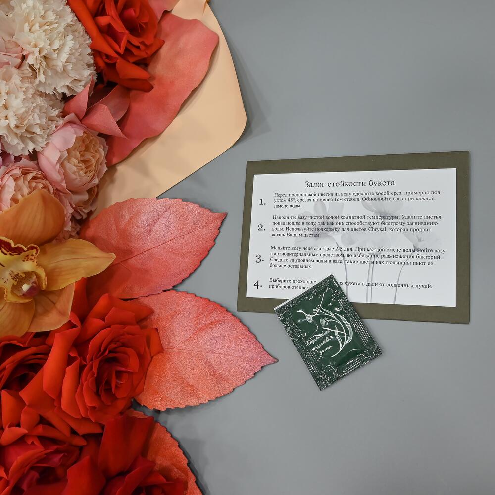 - Сроки возврата: Претензии по качеству букета принимаются в течение 24 часов с момента его получения.