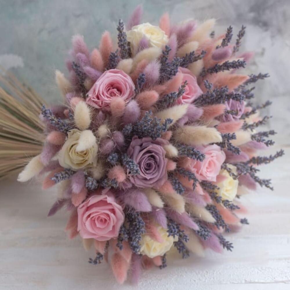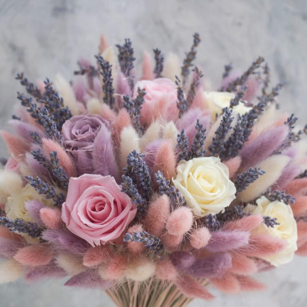 Роза – 9 шт.Лагурус (сухоцвет) – 95 шт.Лаванда (сухоцвет) – 55 шт.Лента атласная – 1 шт.