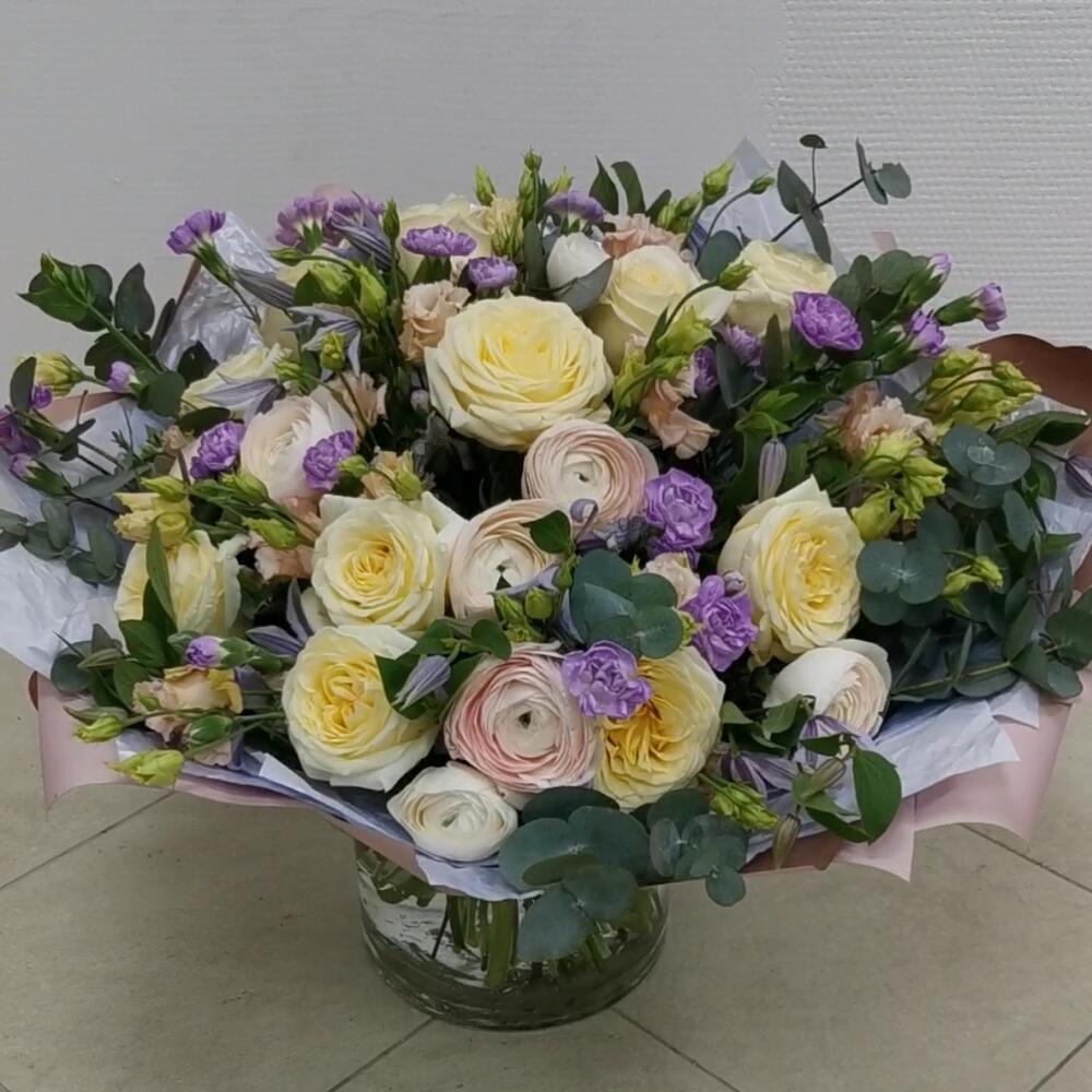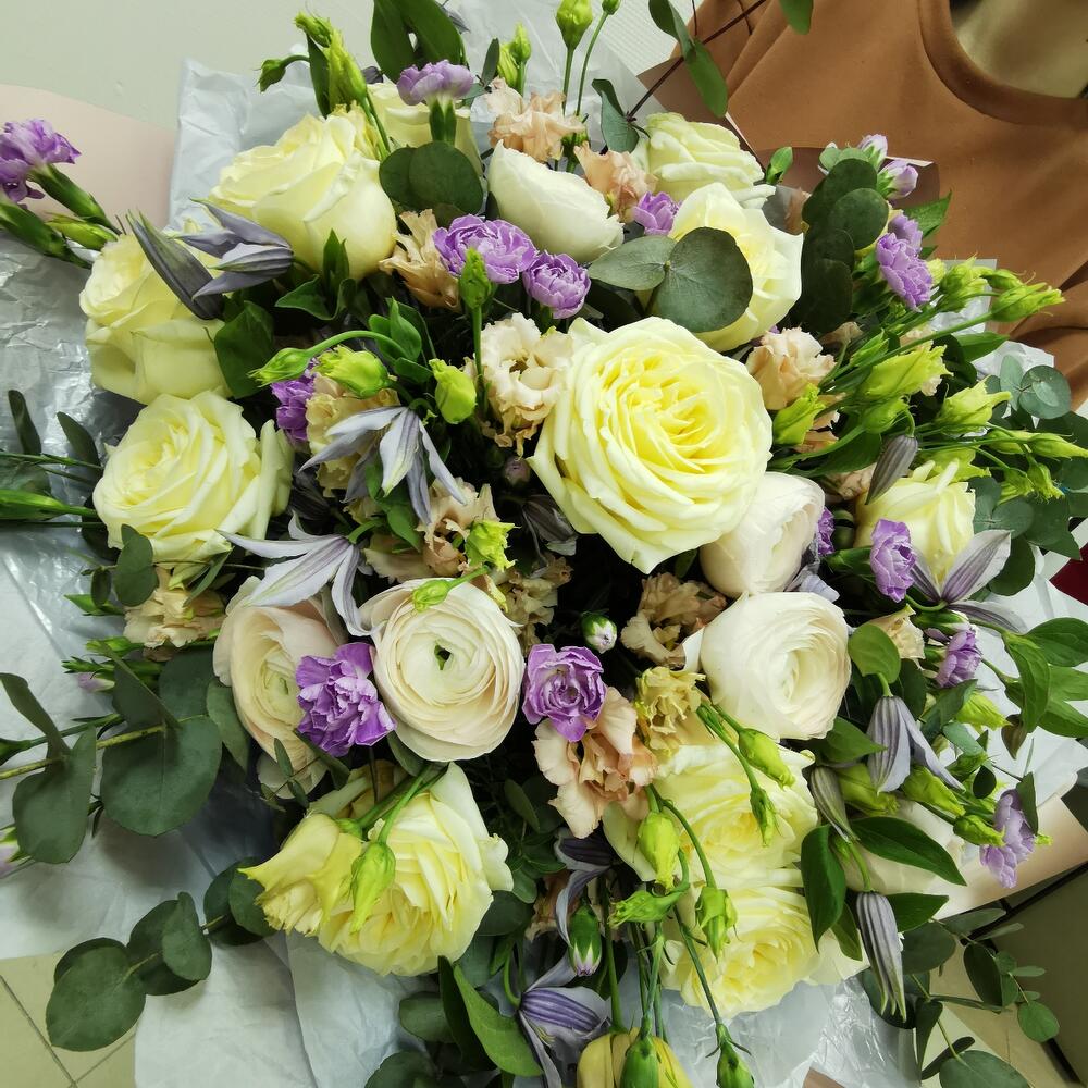 Ранункулюс – 7 шт.Роза пионовидная – 11 шт.Клематис Блю Пируэт – 10 шт.Эустома – 9 шт.Диантус кустовой – 15 шт.Эвкалипт Baby Blue – 10 шт.Фисташка пучок – 1 шт.Упаковка дизайнерская – 4 шт.Бумага тишью – 4 шт.