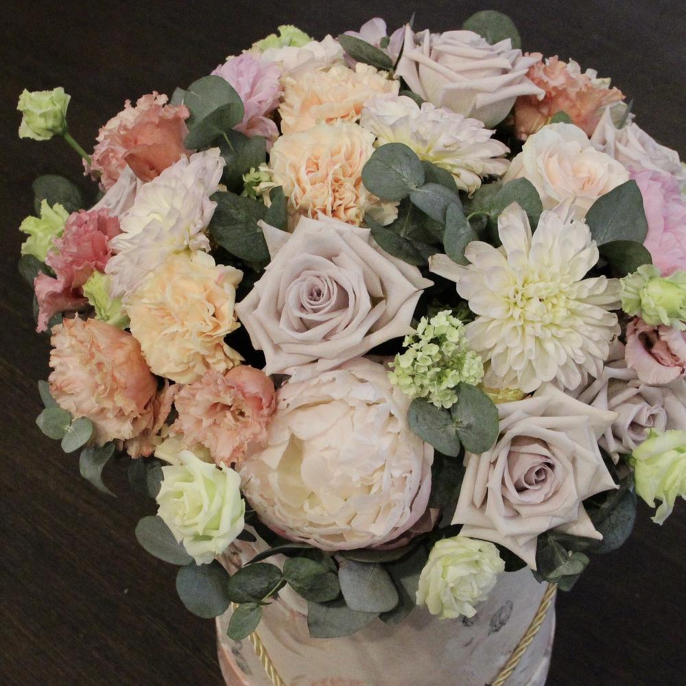 Гвоздики, Лизиантусы, Розы, Тюльпаны