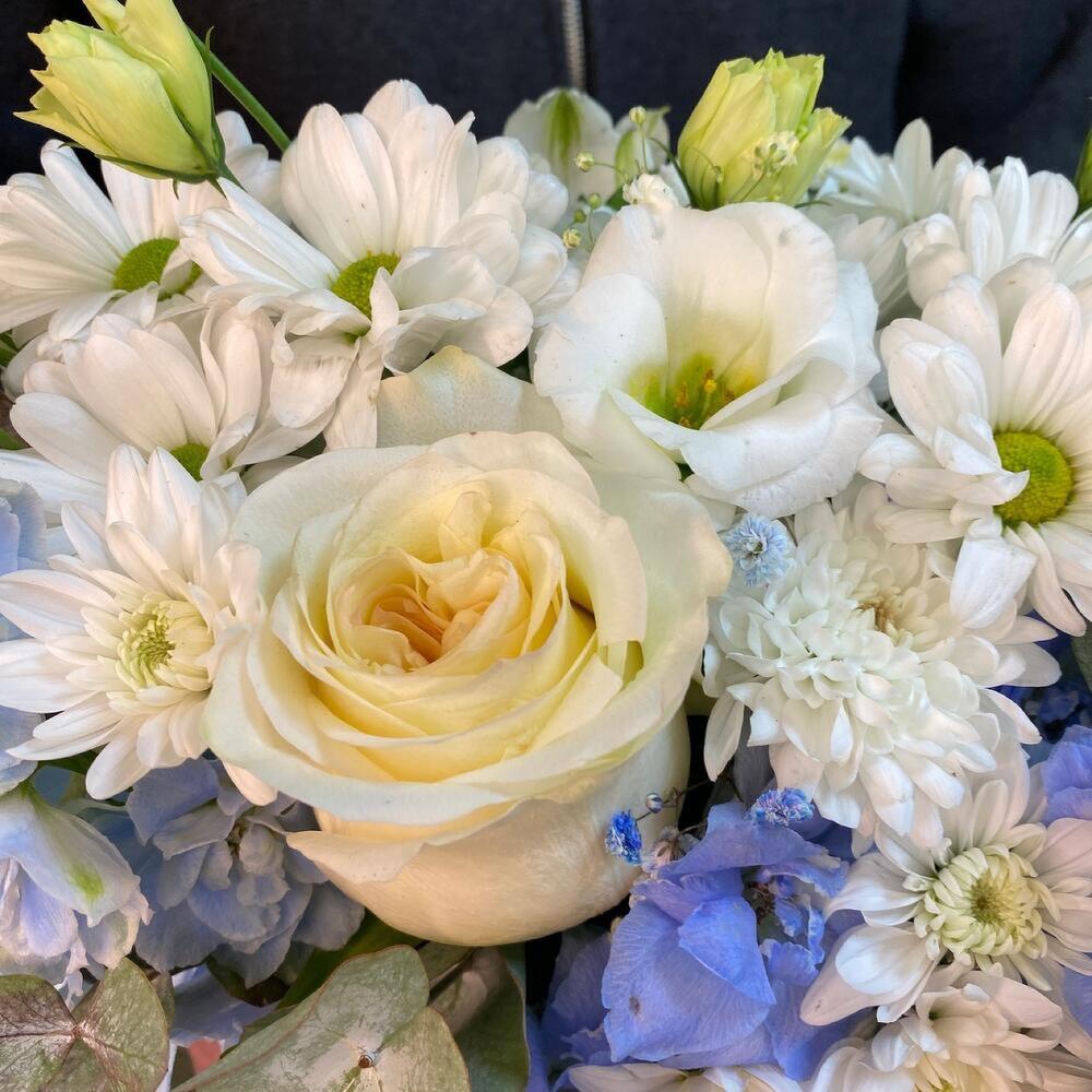 Дельфиниум голубой – 1 шт.Роза Эквадор – 1 шт.Хризантема кустовая – 5 шт.Лизиантус – 2 шт.Эвкалипт – 1 шт.Шляпная коробка с лентами – 1 шт.