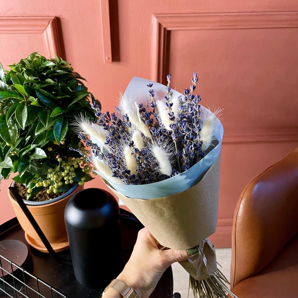 Лаванда (сухоцвет) – 1 шт.Крафт упаковка – 1 шт.Лагурус (сухоцвет) – 11 шт.жгут натуральный – 1 шт.