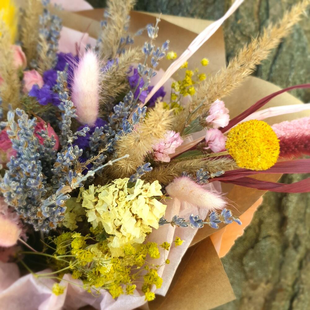 Колоски – 11 шт.Крафт упаковка – 2 шт.Лаванда (сухоцвет) пучок – 1 шт.Шпагат джутовый – 1 шт.гипсофила сухоцвет ветка – 1 шт.лагурус (сухоцвет) розовый – 7 шт.статица синяя сухоцвет – 3 шт.статица желтая сухоцвет – 2 шт.розы сухоцвет микс – 3 шт.краспедия желтая сухоцвет – 2 шт.статица розовая сухоцвет – 1 шт.