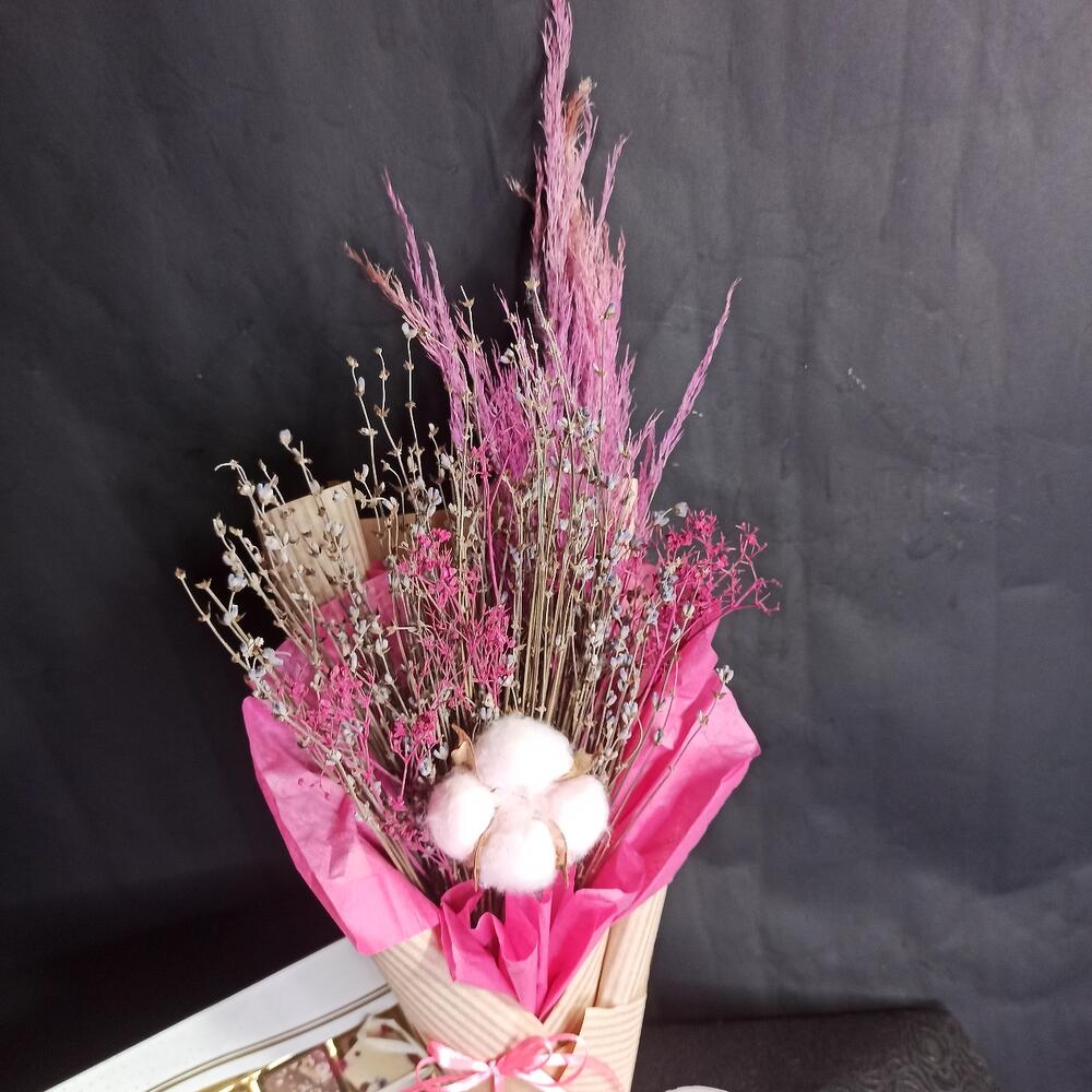 Лаванда (сухоцвет) пучок – 1 шт.Хлопок натуральный – 1 шт.гипсофила радужная – 1 шт.Упаковка дизайнерская – 2 шт.Лента атласная – 2 шт.